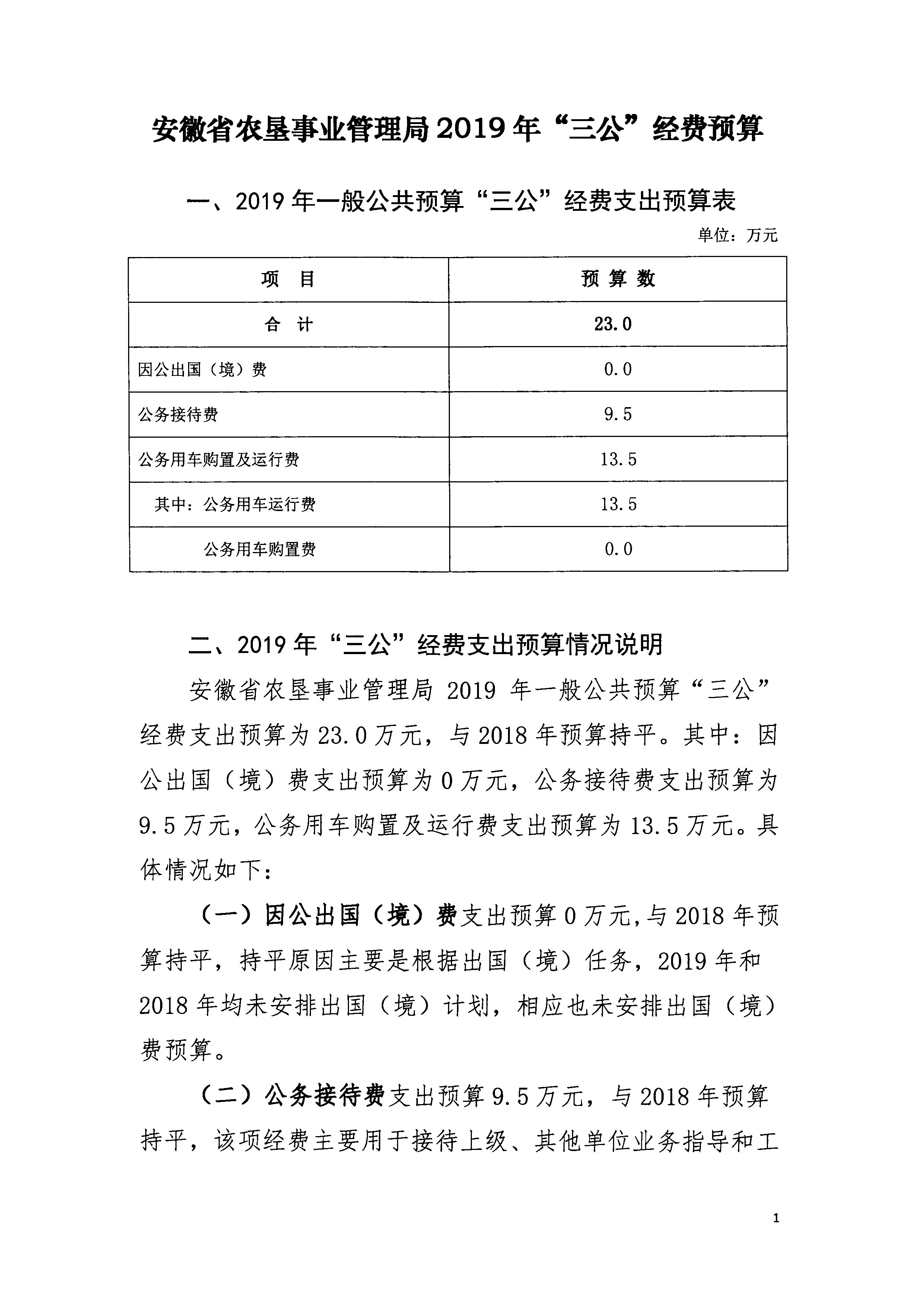 安徽省农垦事业管理局2019年“三公”经费预算